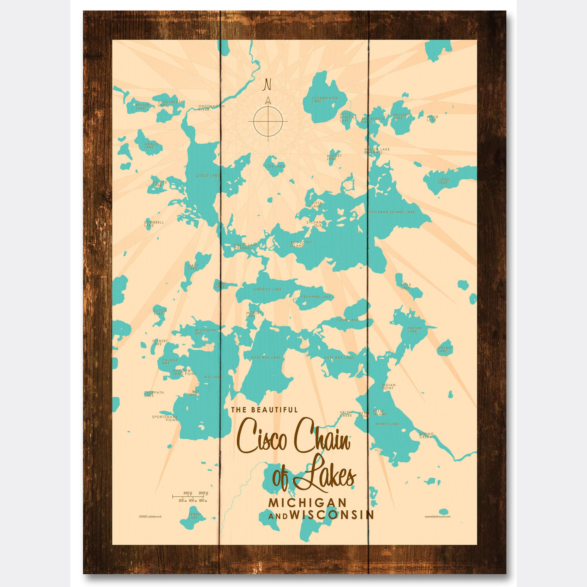 Cisco Chain of Lakes WI Michigan, Rustic Wood Sign Map Art